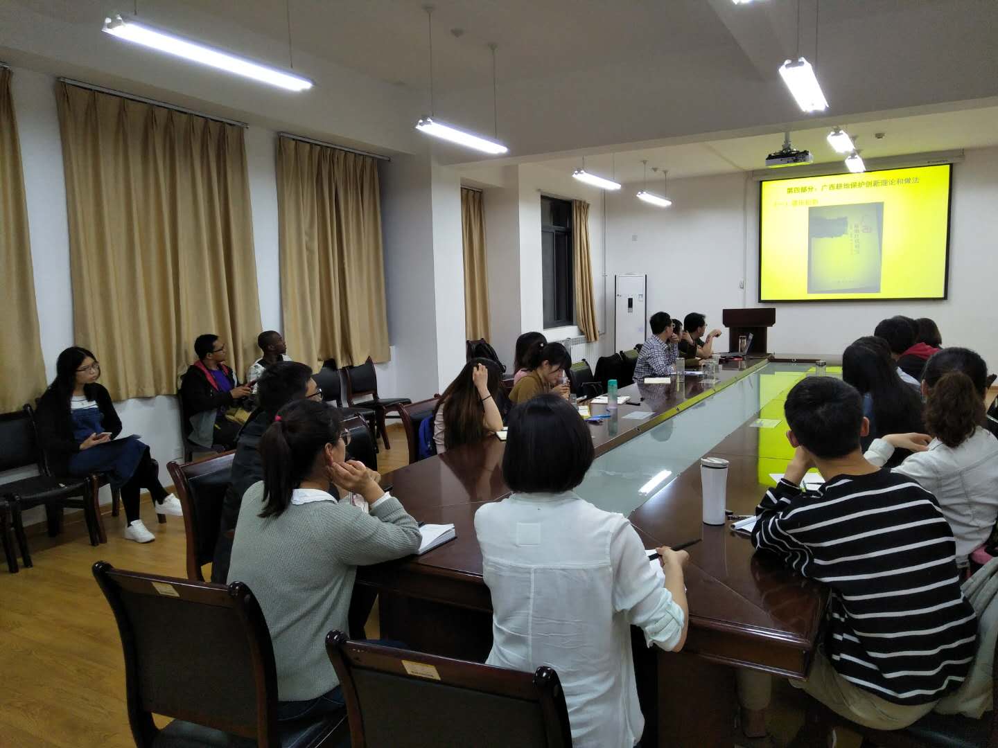 2018年4月19日晚上,在威尼斯金沙欢乐娱人城南校区经管学院C304,为全面践行“乡村振兴”战略,广西国土资源厅行政审批办公室主任左旭阳应邀为师生做“广西耕地保护实践与管理创新”的主题报告,经管学院副院长石宝峰主持报告会,土地资源管理专业张道军副教授、张会老师、张蚌蚌老师,硕士博士生和留学生等30余人一起聆听了报告会。