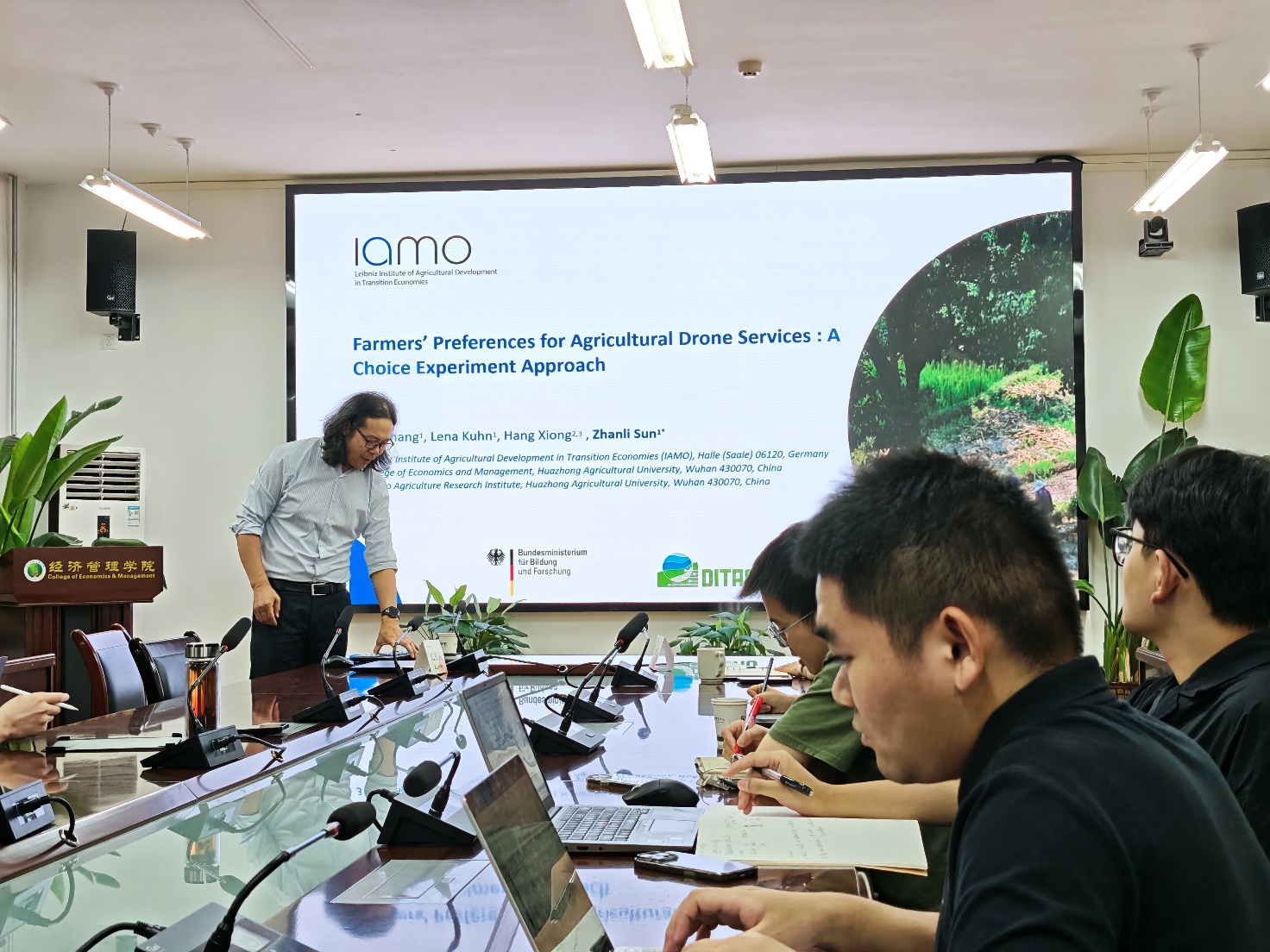 孙战利高级研究员以“Farmers’ Preferences for Agricultural Drone Services : A Choice Experiment Approach”为题分享了其最新论文成果,围绕研究背景、研究设计、实证结果及政策建议等方面进行了深入阐述。他指出,在集体采用的前提下,农户对农业无人机服务(ADS)整体持积极态度,其平均支付意愿显著高于市场价格。其中,服务提供者“本地性”是影响采纳意愿的关键因素,优先于合同协议类型,表明在农村传统熟人信任机制依然发挥重要作用。此外,对于年轻、受教育程度高、农业收入高、拥有小型农场、通过口口相传学习无人机并有采用经验的农户来说,更倾向于采纳该服务。在交流环节,师生积极提问,与孙战利高级研究员就支付意愿(WTP)测算方法、选择实验方法和学术期刊投稿策略等问题进行了热烈讨论。大家一致认为,该研究为理解农户技术采纳行为提供了重要实证支持,对推动农业技术服务模式创新具有积极意义。